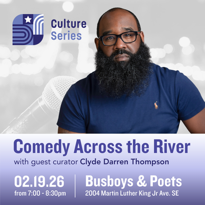 Who gets to laugh together, and what is lost when communities east of the Anacostia are left out? Find out Feb 19 at the next Culture Series. Join guest curator Clyde Darren Thompson for stand up performances by DC comedians, followed by a panel discussion.