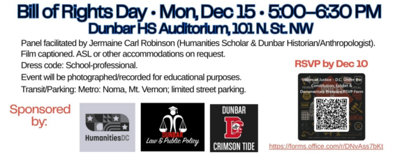 Come see the work of a group of Constitutional Law students worked proudly for the whole of term 1 to educate themselves and create for others to see. Youth voices meet the Bill of Rights in D.C. – where local choices collide with federal oversight. See what happens when students turn interviews into public history. See it – student-curated exhibits built from original oral histories. Hear it – Short documentaries connecting the Bill of Rights to D.C. life. Discuss it – Expert panel on Home Rule, federal oversight, and youth voice in policy.
